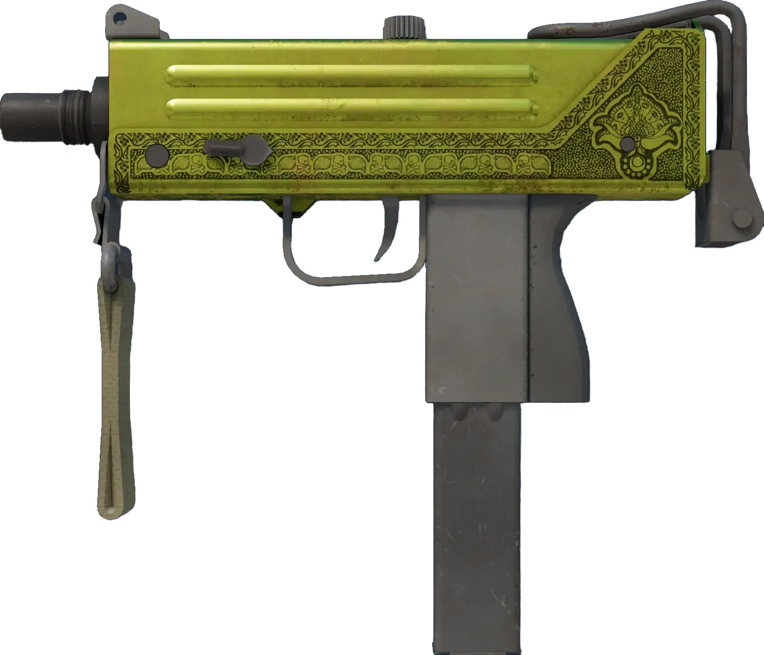 Essentially a box that bullets come out of, the MAC-10 SMG boasts a high rate of fire, with poor spread accuracy and high recoil as trade-offs. This memento from Gwalior has engraved brass parts. _It breaks two commandments at the same time_