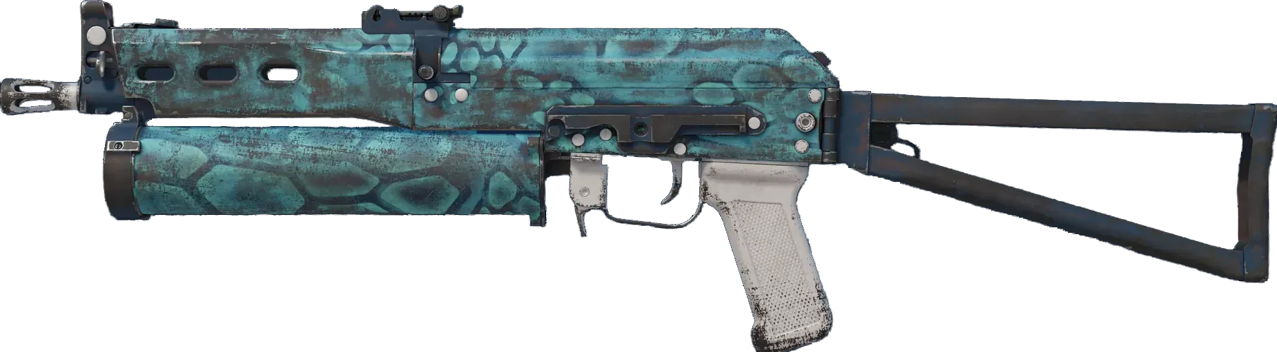 The Bizon SMG is low-damage, but offers a uniquely designed high-capacity drum magazine that reloads quickly. It has been spray painted with a blue pebble pattern. _Your intentions are clear_
