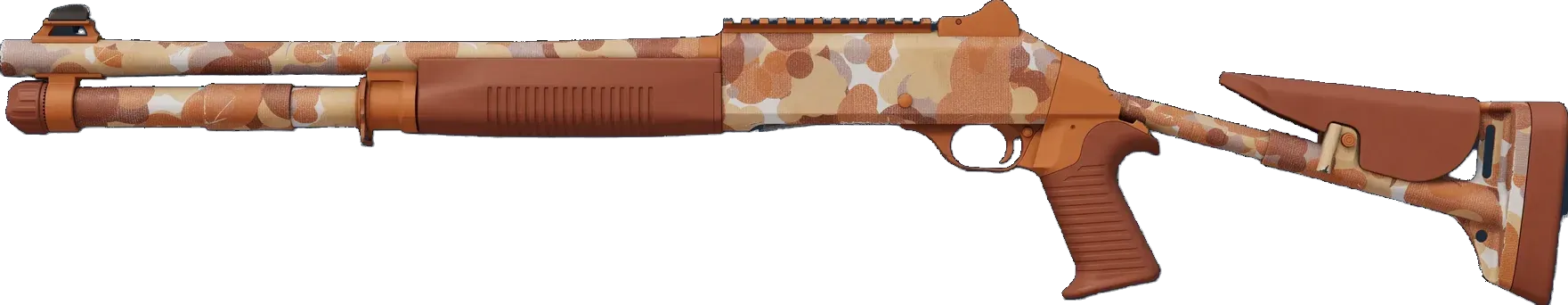 The XM1014 is a powerful fully automatic shotgun that justifies its heftier price tag with the ability to paint a room with lead fast. A pattern of orange, tan, and brown spots has been applied. _Spotty coverage_