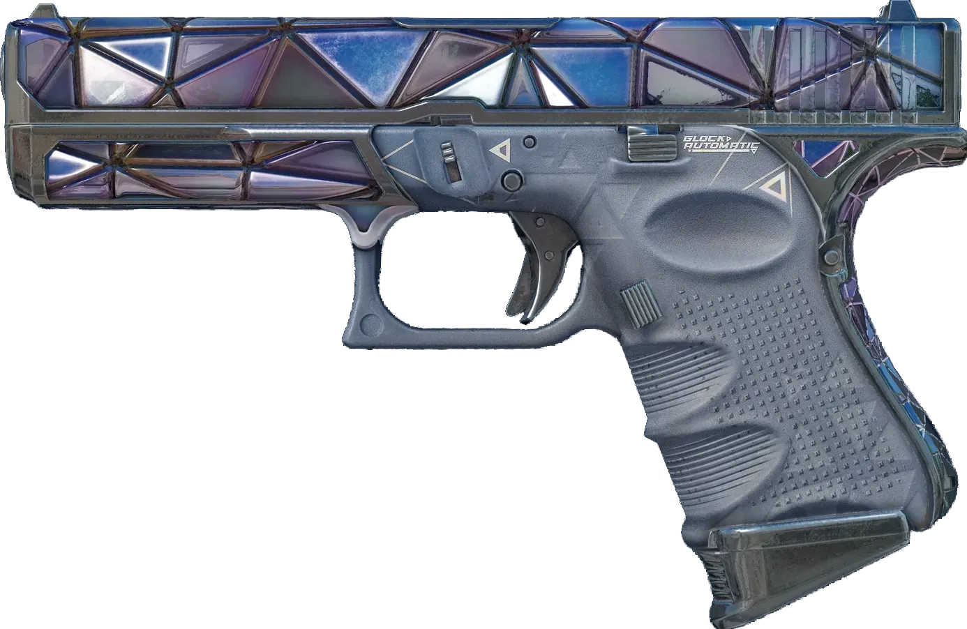 The Glock 18 is a serviceable first-round pistol that works best against unarmored opponents and is capable of firing three-round bursts. It has been custom painted to resemble a mosaic of mirrors. _Trapped in your own thoughts_