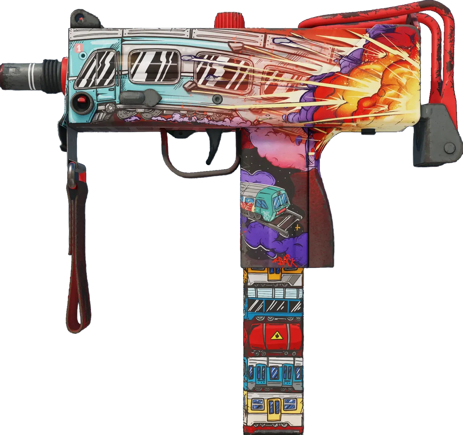 Essentially a box that bullets come out of, the MAC-10 SMG boasts a high rate of fire, with poor spread accuracy and high recoil as trade-offs. It has been custom painted with an exploding train car. _"Your attention please..."_