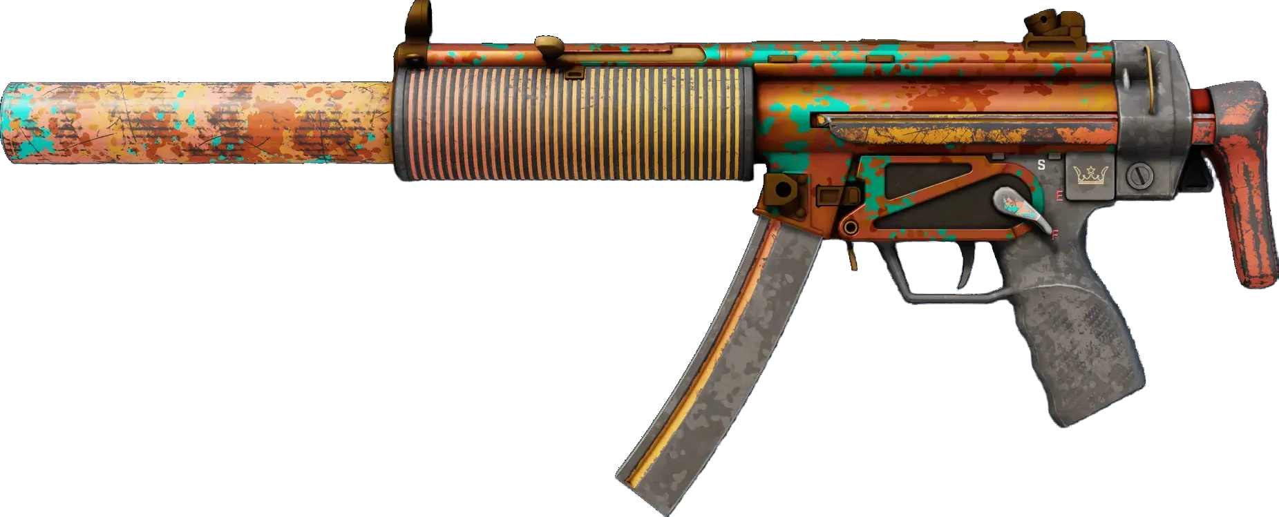 Often imitated but never equaled, the iconic MP5 is perhaps the most versatile and popular SMG in the world. This SD variant features an integrated silencer, making an already formidable weapon whisper-quiet. A brightly-colored orange and teal camouflage pattern has been applied. The weapon has been finished with gold accents. _A weapon this quiet shouldn't be so loud_