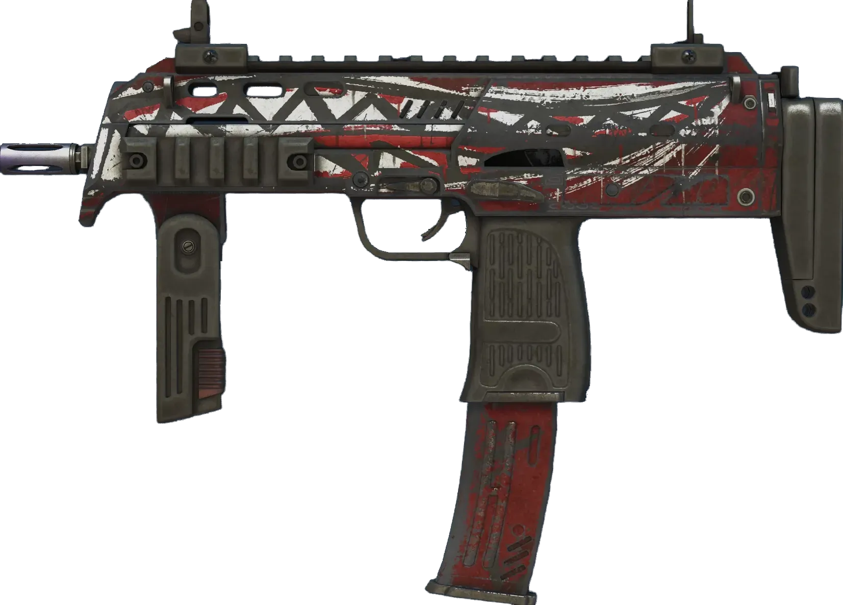 Versatile but expensive, the German-made MP7 SMG is the perfect choice for high-impact close-range combat. A concerning black and white smile has been painted atop a red base. _Up to no good_