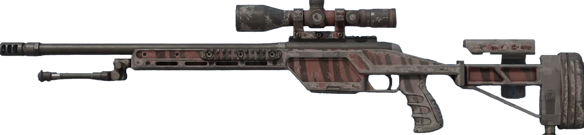 The SSG08 bolt-action is a low-damage but very cost-effective sniper rifle, making it a smart choice for early-round long-range marksmanship. It has been spray-painted with a rust colored zebra stripe pattern. _Eat, sleep, hunt, repeat_