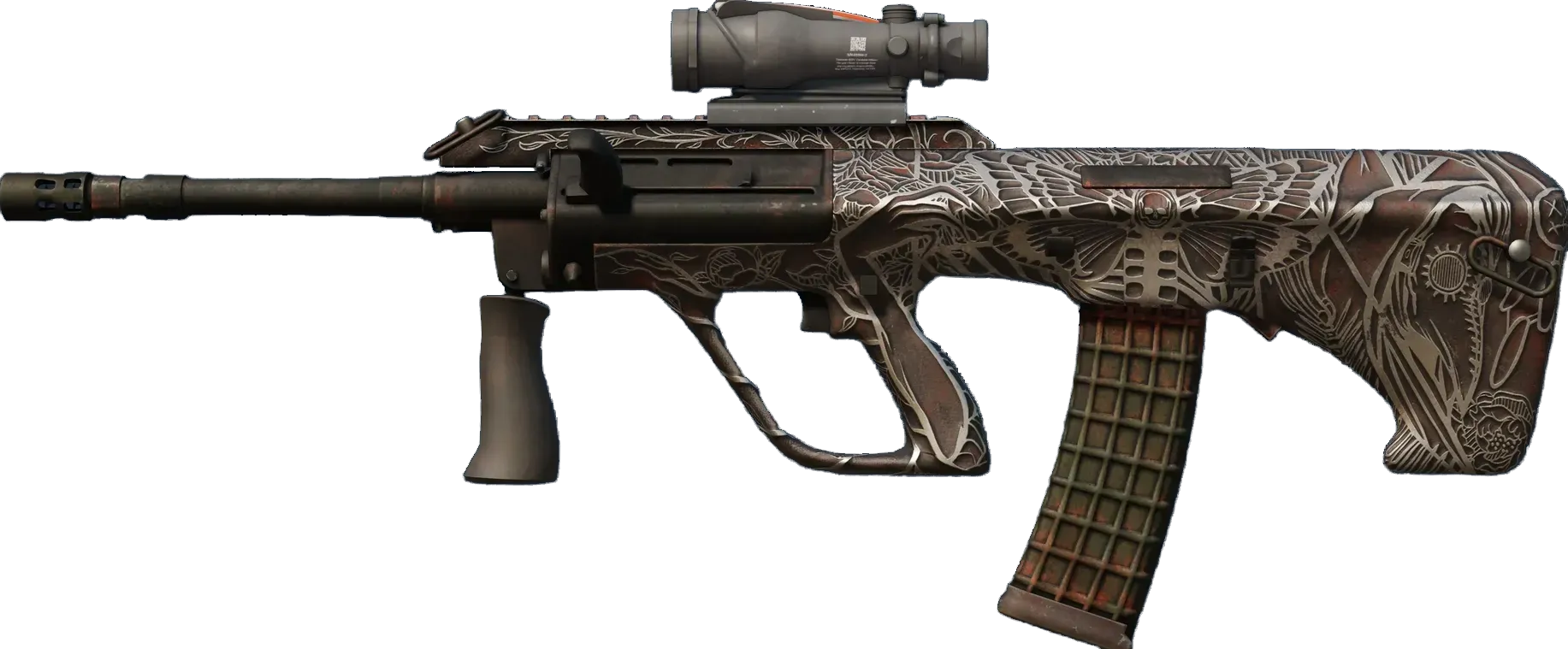 Powerful and accurate, the AUG scoped assault rifle compensates for its long reload times with low spread and a high rate of fire. It has been custom painted using dark fantasy and horror as inspiration. _"Like a moth to a flame"_