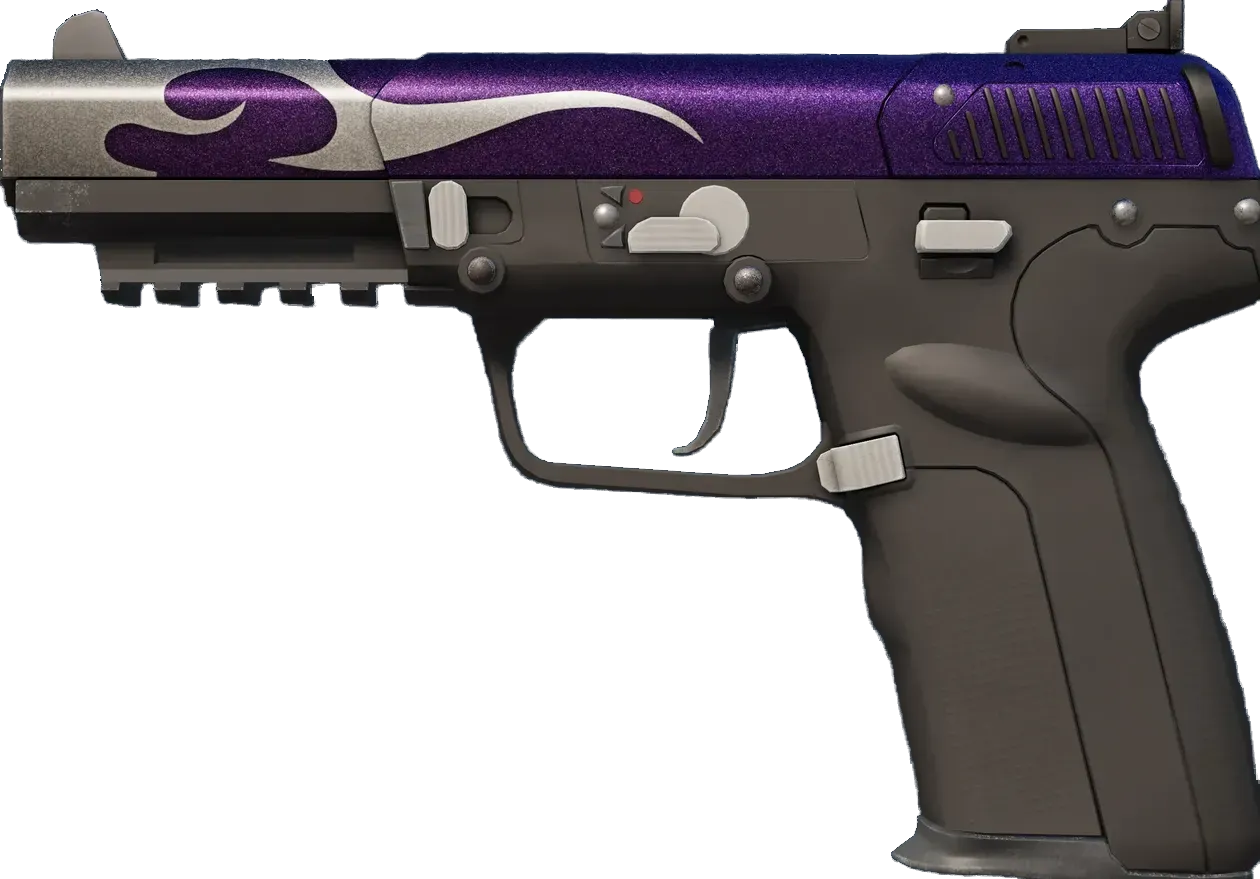 Highly accurate and armor-piercing, the pricy Five-Seven is a slow-loader that compensates with a generous 20-round magazine and forgiving recoil. A silver flame on the muzzle overlays a purple base with a metal flake finish. _Element detected: Cs_