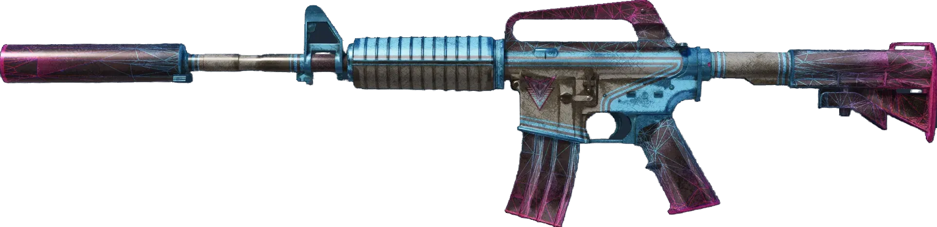 With a smaller magazine than its unmuffled counterpart, the silenced M4A1 provides quieter shots with less recoil and better accuracy. It has been custom painted with totally radical blue and pink highlights. _Quiet retrofuturism_