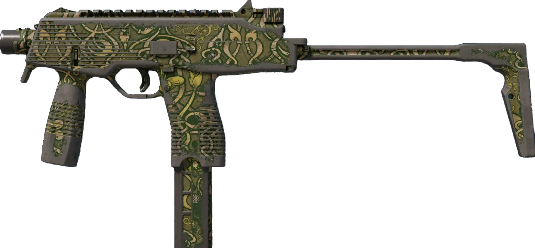 Manufactured in Switzerland, the cutting-edge MP9 SMG is an ergonomic polymer weapon favored by private security firms. It has been spray-painted with a vine and flower pattern in various shades of green. _Established, seasoned, weathered—you can just say "old"_