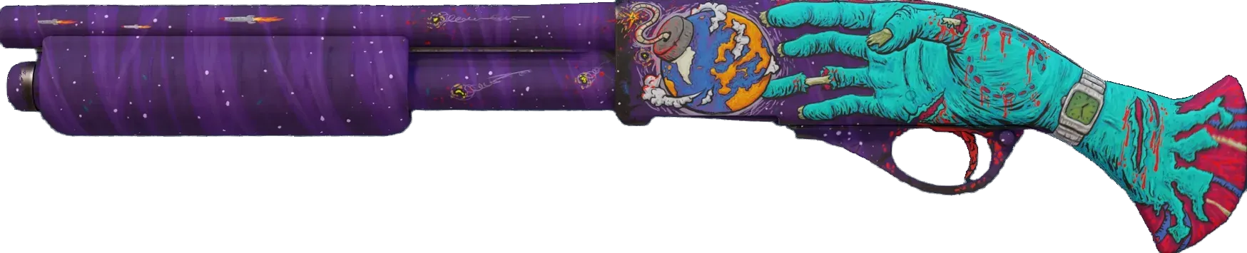 The classic Sawed-Off deals very heavy close-range damage, but with its low accuracy, high spread and slow rate of fire, you'd better kill what you hit. A decomposing hand reaching for a bomb-like planet has been custom painted over a purple outer space background. _"Have you got the time?"_