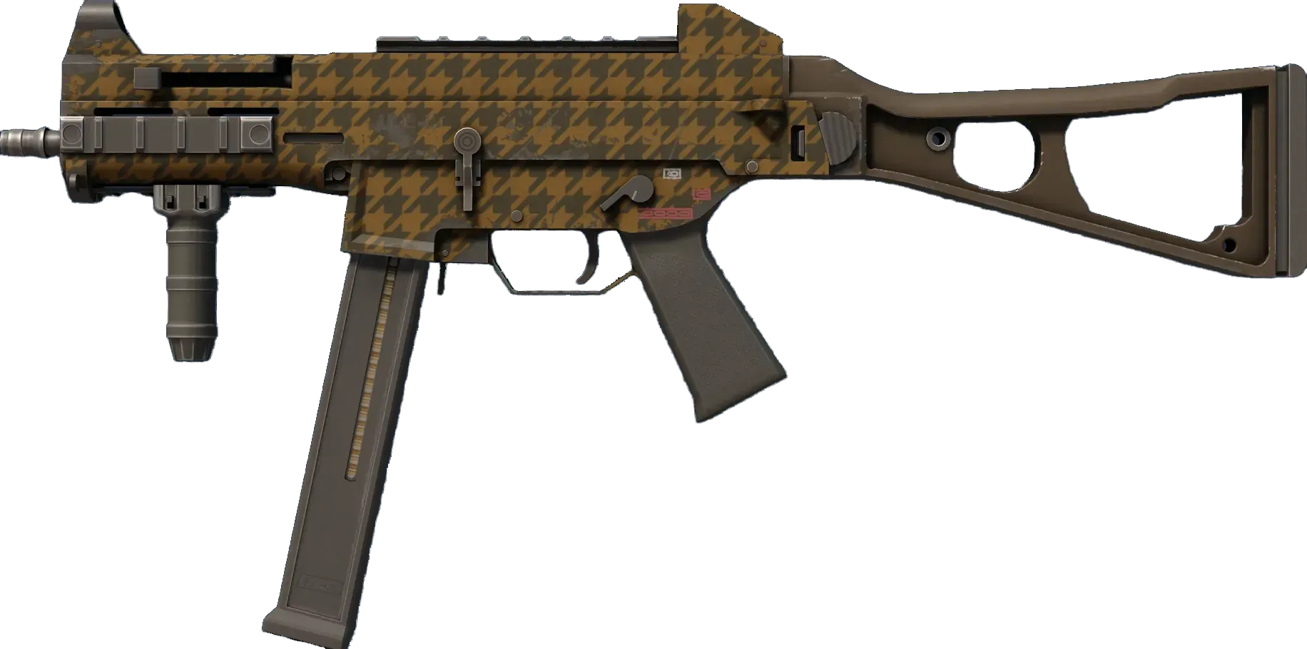 The misunderstood middle child of the SMG family, the UMP45's small magazine is the only drawback to an otherwise versatile close-quarters automatic. A brown houndstooth hydrographic pattern has been applied. _Equip for the role you want, not the role you have_