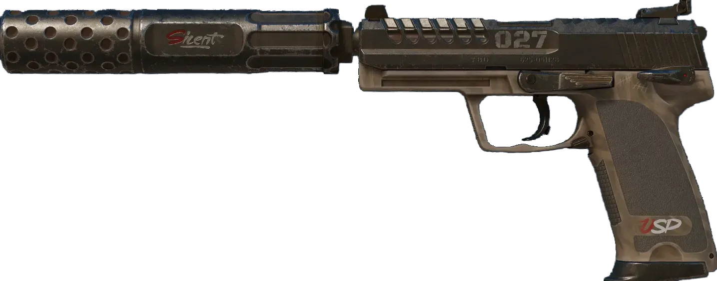 A fan favorite from Counter-Strike Source, the Silenced USP Pistol has a detachable silencer that gives shots less recoil while suppressing attention-getting noise. This custom paint job features a winged defuser beneath the rear sight and "027" near the ejection port. _Light field work_
