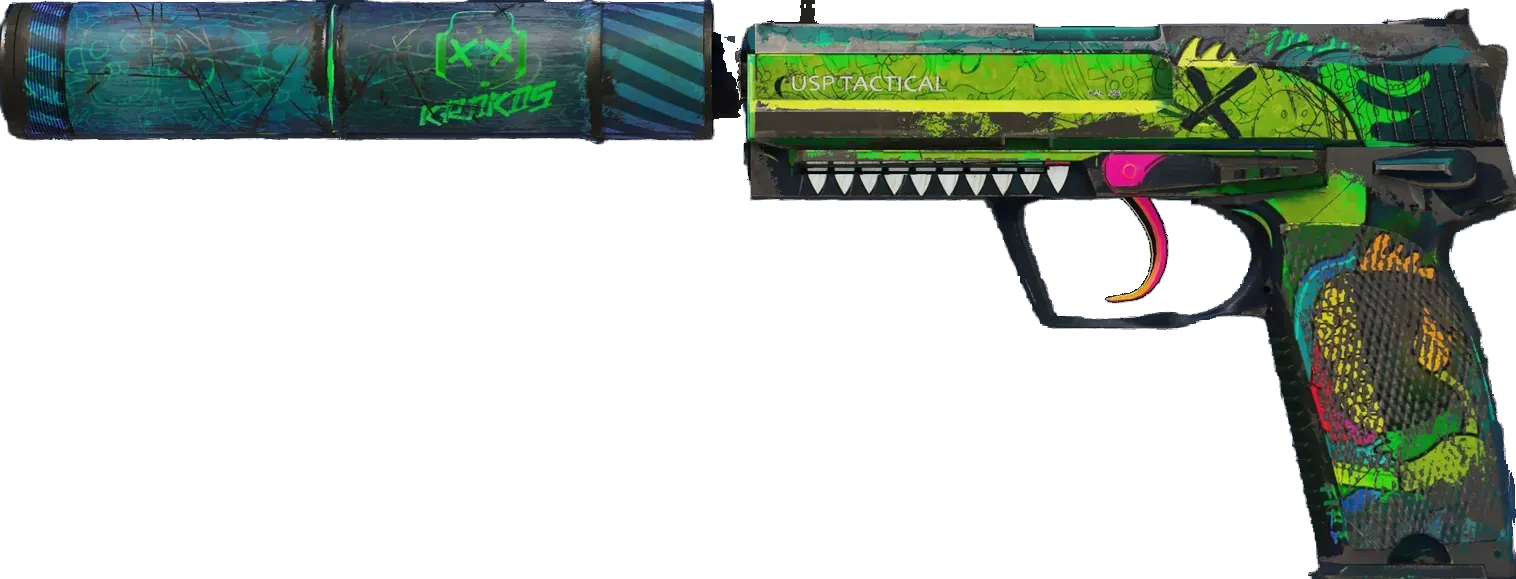 A fan favorite from Counter-Strike Source, the Silenced USP Pistol has a detachable silencer that gives shots less recoil while suppressing attention-getting noise. A custom paint job featuring a green monster and other icons inspired by popular urban art has been applied. The silencer has a pearlescent finish. _X__X_