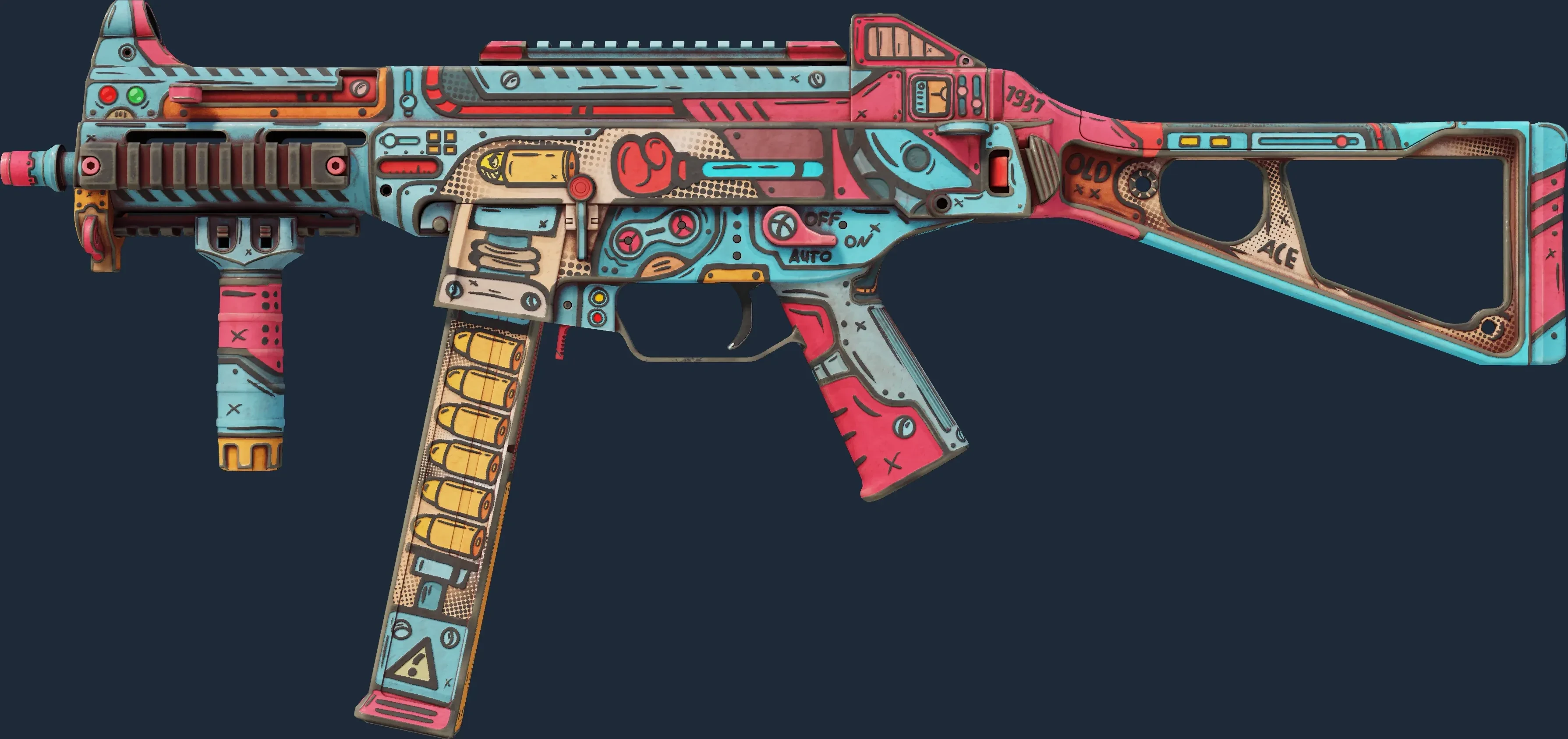 The misunderstood middle child of the SMG family, the UMP45's small magazine is the only drawback to an otherwise versatile close-quarters automatic. This custom paint job is inspired by old animation cartoons. _Swing and a miss!_