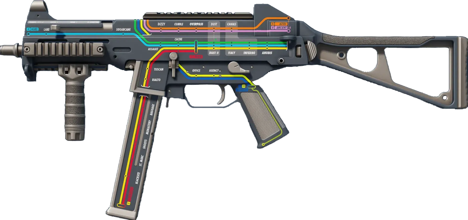 The misunderstood middle child of the SMG family, the UMP45's small magazine is the only drawback to an otherwise versatile close-quarters automatic. It has been custom painted with fictitious transit diagrams designed around the maps of Counter-Strike. _"Now arriving at green line stop number four, Dust II"_
