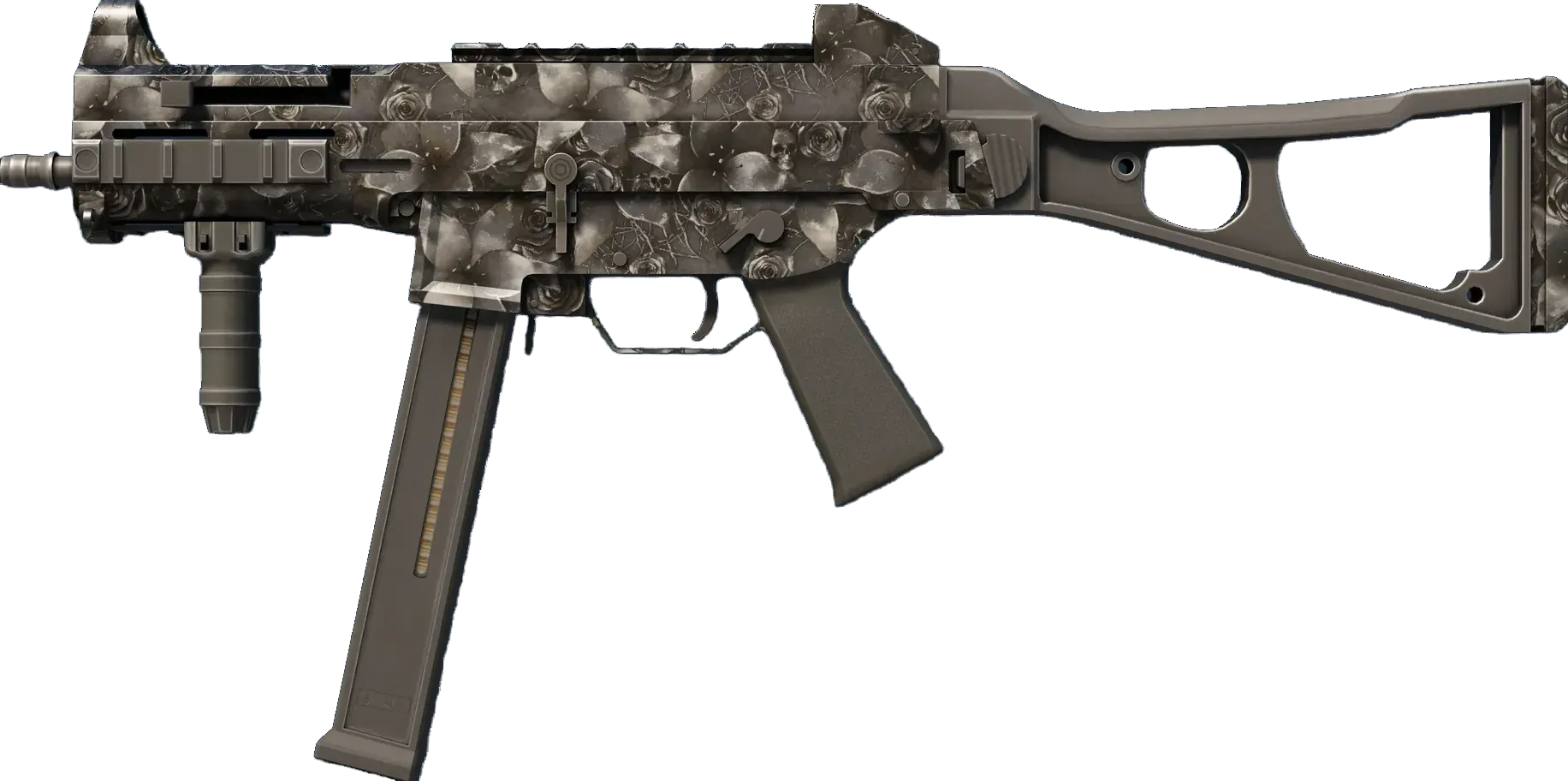 The misunderstood middle child of the SMG family, the UMP45's small magazine is the only drawback to an otherwise versatile close-quarters automatic. It has been given a steel-colored pattern of funeral roses. _In memoriam_