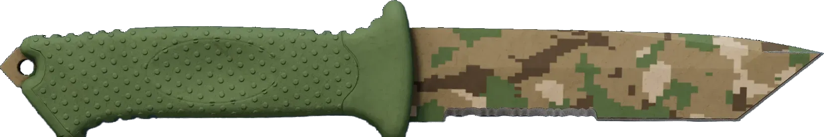 This tanto-style survival knife features a faceted blade and full tang, complete with impact pommel. No fuss, no moving parts - just a reliable blade that's ready to work. It has been painted using a Digital Disruptive Pattern (DDPAT) hydrographic. _By the time you're close enough to notice the pixels it's already too late_