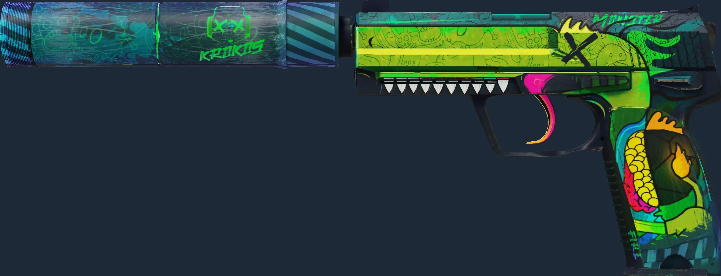 This USP-S has been painted in a "Custom Paint Job" style, with the Monster Mashup finish. This style enables extremely customized looks in a full range of colors. The primary color of this skin is composed of a green tint. Different pattern indexes have no effect on the Monster Mashup finish. The skin uses the old legacy model.