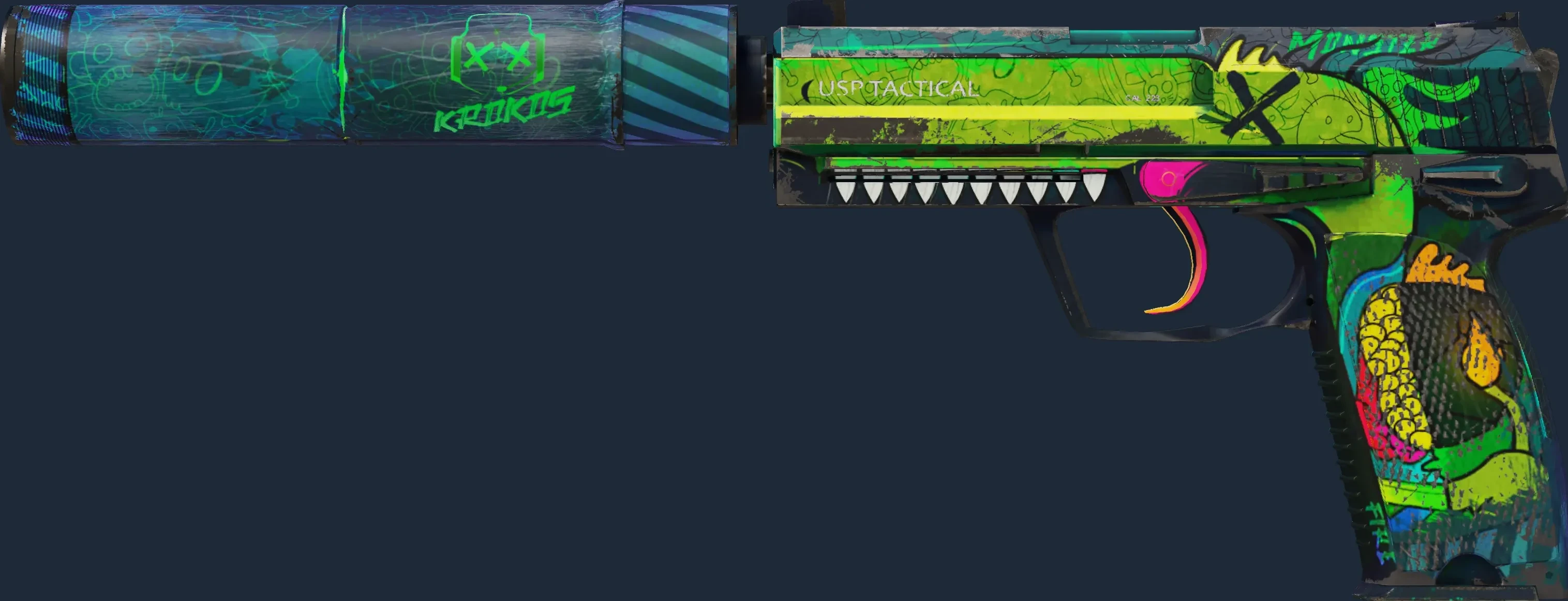 The USP-S | Monster Mashup is a Covert grade skin for the USP-S in Counter-Strike 2. It features a Custom Paint Job finish and was designed by Nextgenz.