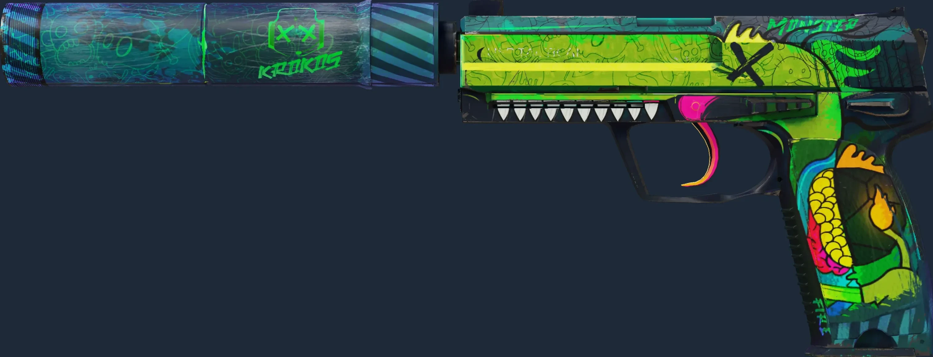 The USP-S | Monster Mashup is a Covert grade skin for the USP-S in Counter-Strike 2. It features a Custom Paint Job finish and was designed by Nextgenz.