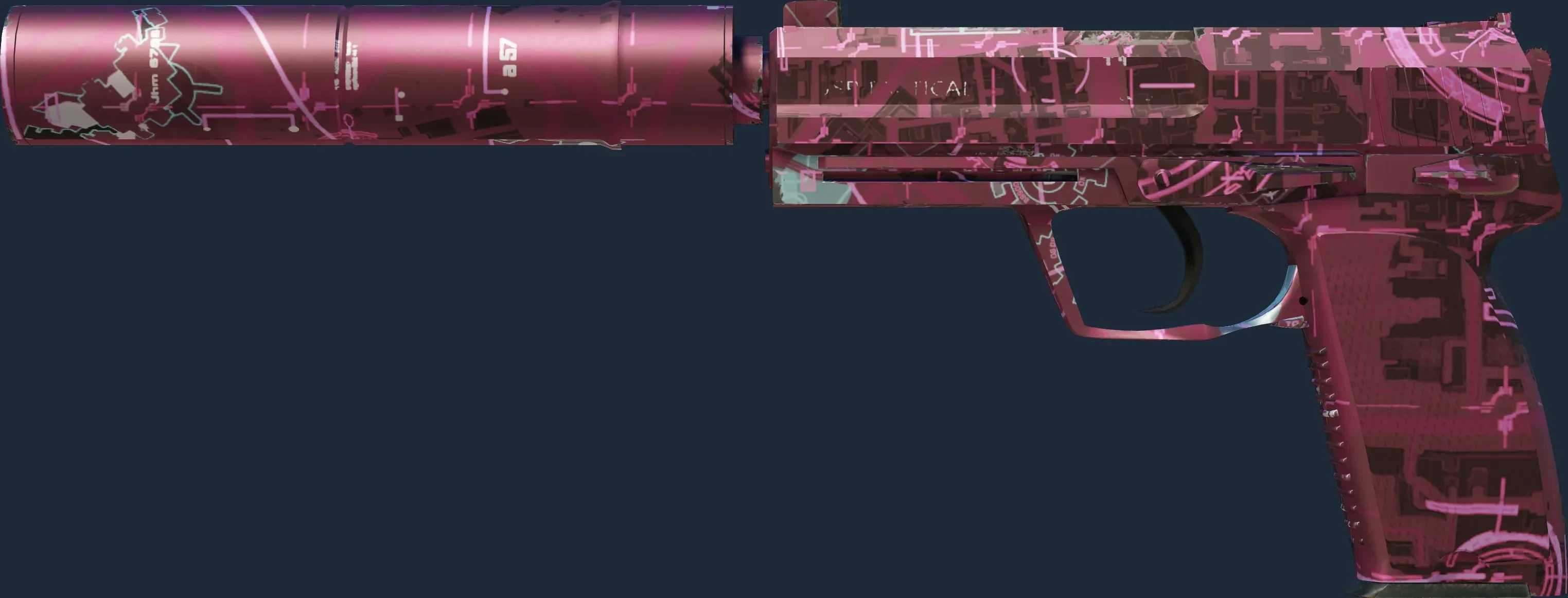 This USP-S has been painted in a "Anodized Multicolored" style, with the Target Acquired finish. In this style, the candy coat may be applied in a multicolored pattern. In the real world, methods could include silk-screening or adherable stencils. The primary color of this skin is composed of a pink tint. The look of the Target Acquired finish is affected by its pattern index. The skin uses the old legacy model.