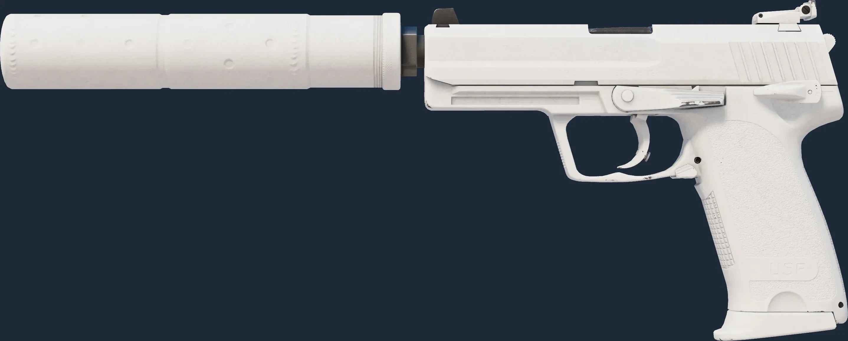 This USP-S has been painted in a "Solid Color" style, with the Whiteout finish. Individual components of the weapon are painted with up to four unique colors before reassembly. The primary color of this skin is composed of a white tint. Different pattern indexes have no effect on the Whiteout finish. The skin uses the new CS2 model.