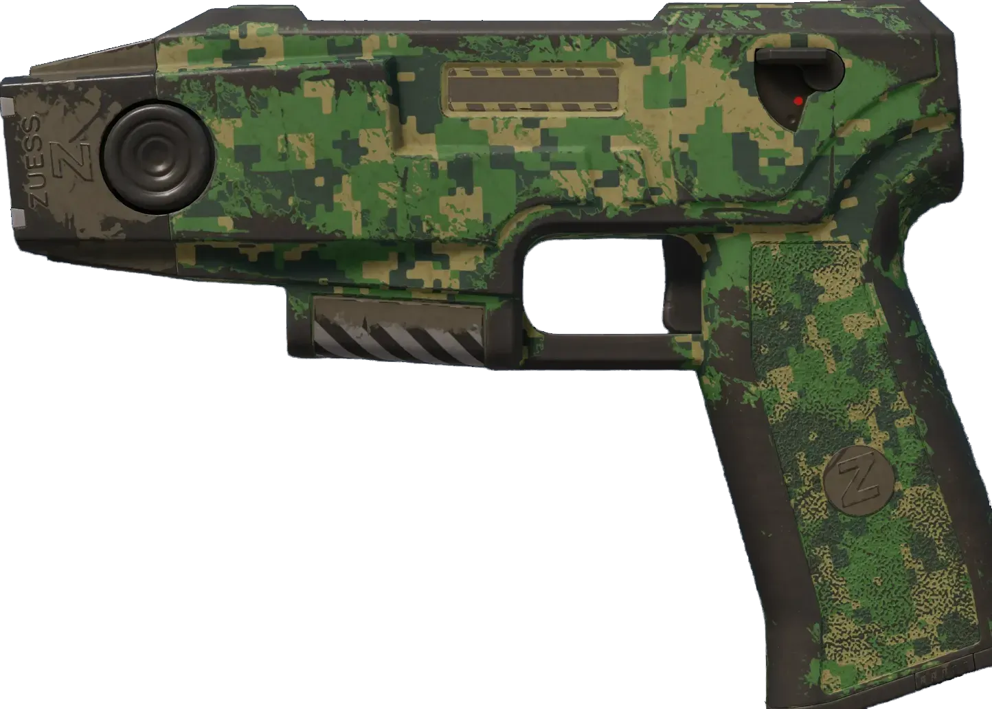 Perfect for close-range ambushes and enclosed area encounters, the rechargeable x27 Zeus is capable of incapacitating an enemy in a single hit. A green and sand-colored hydrographic digital camo pattern has been applied. _Look twice, then look again_